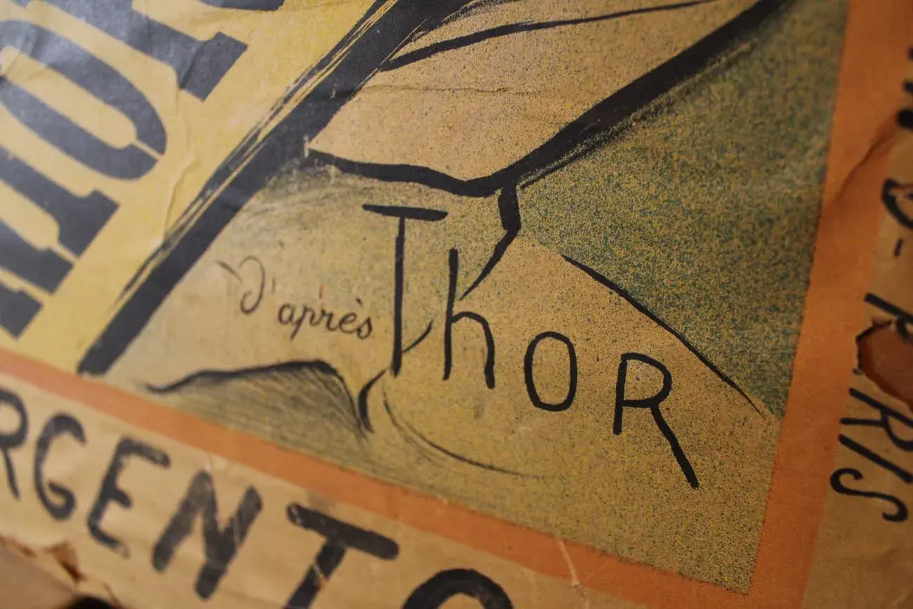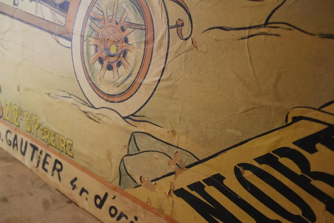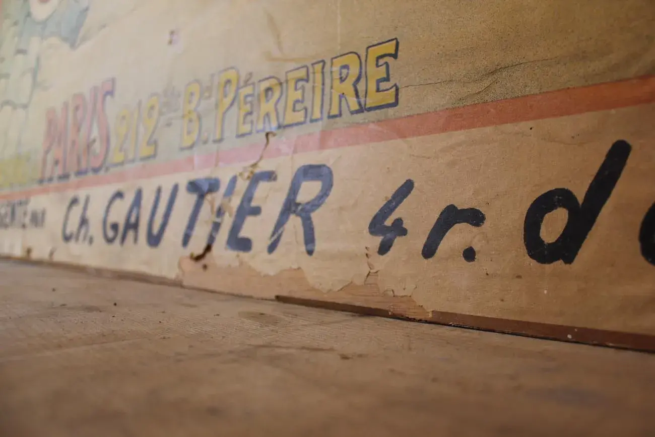 Collée sur un panneau de bois, cette affiche raconte une histoire unique et témoigne de l’audace publicitaire de l’époque.
