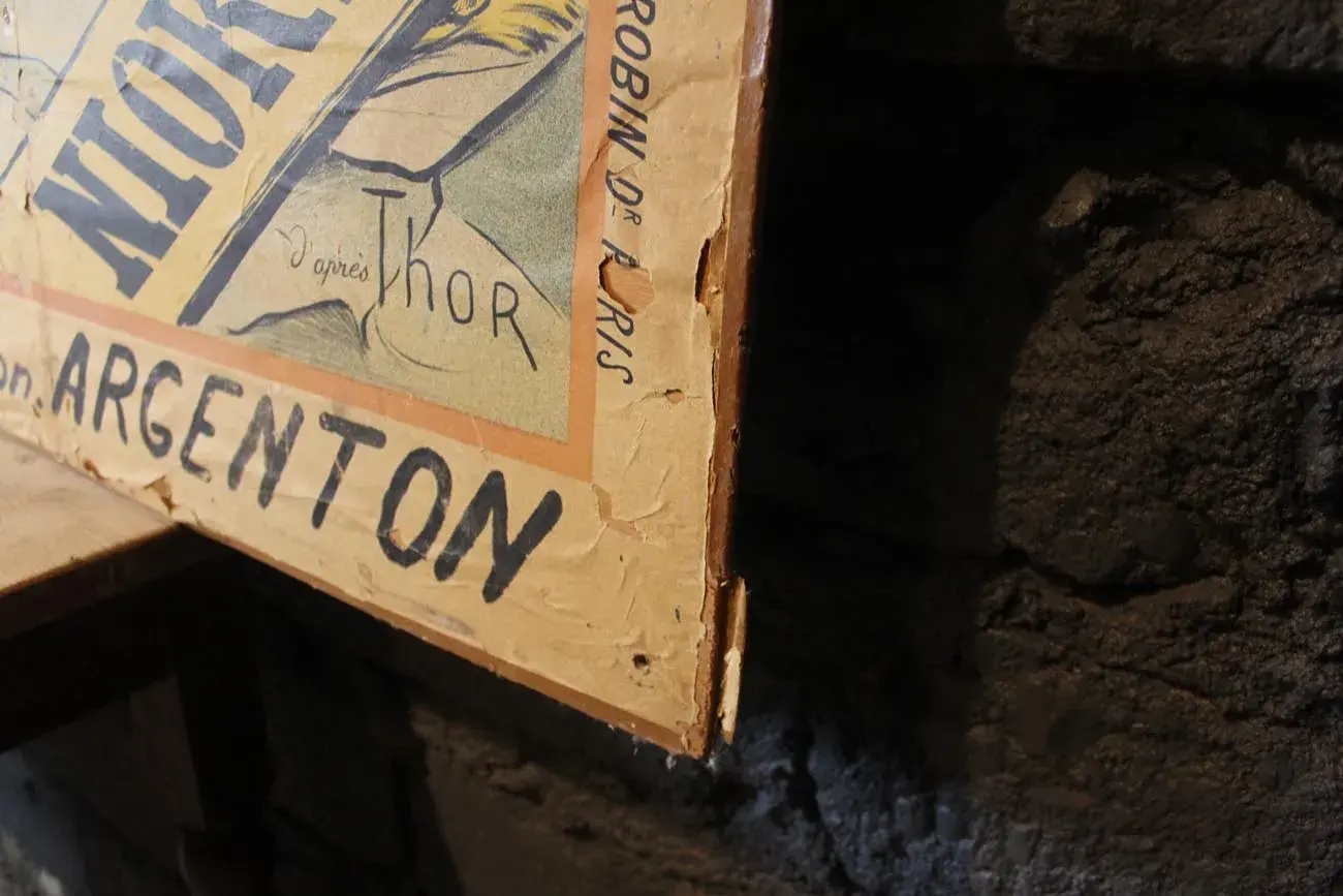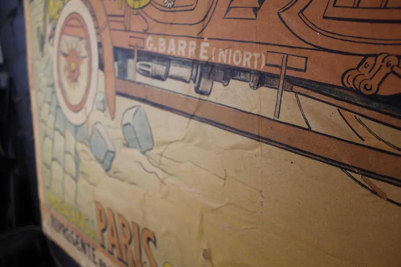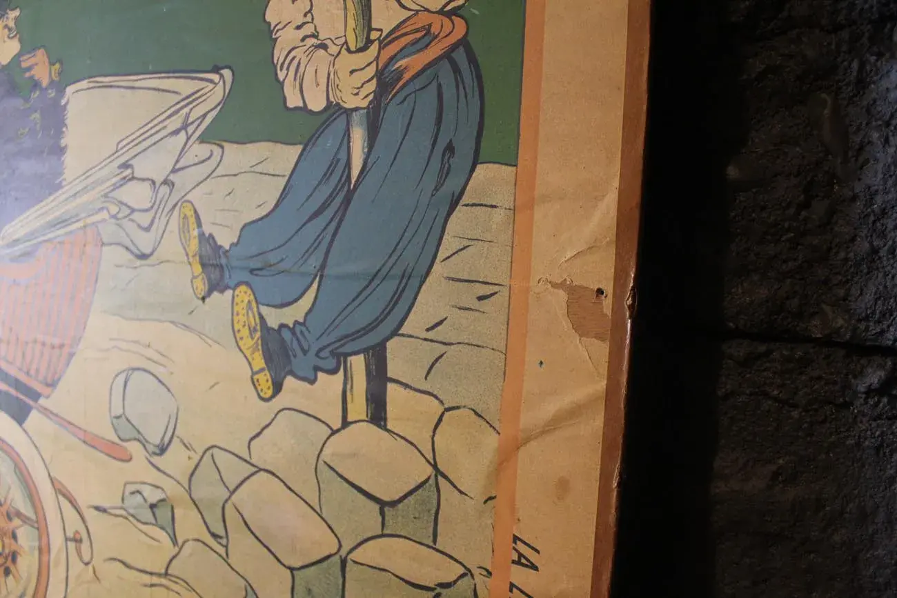 Collée sur un panneau de bois, cette affiche raconte une histoire unique et témoigne de l’audace publicitaire de l’époque.