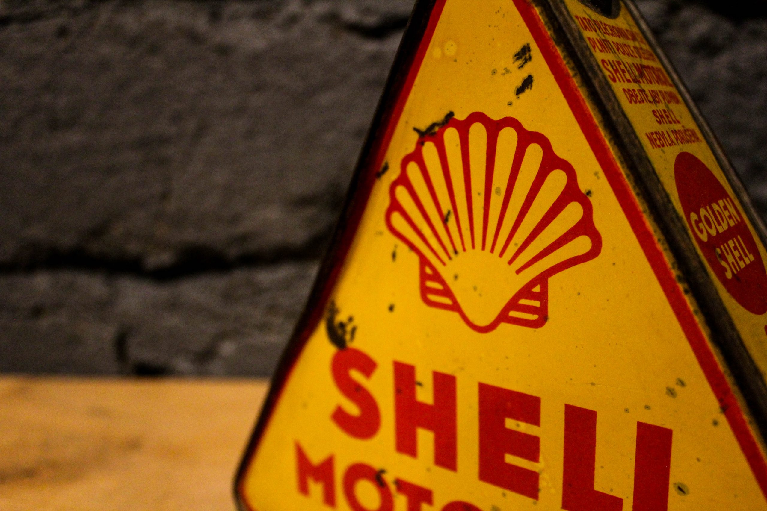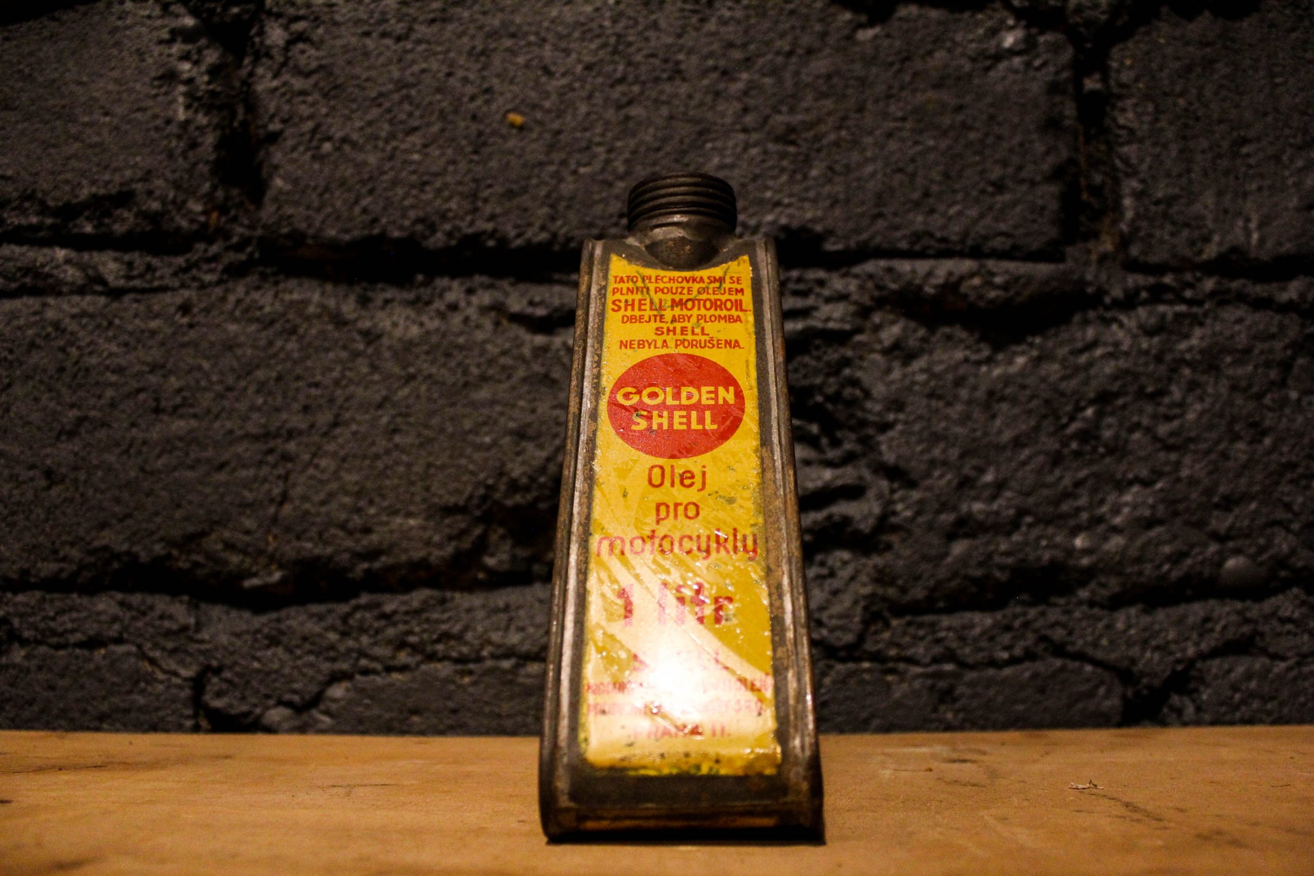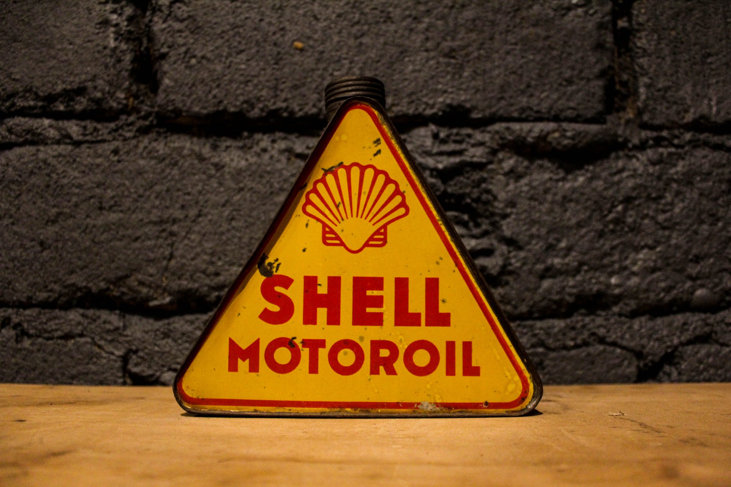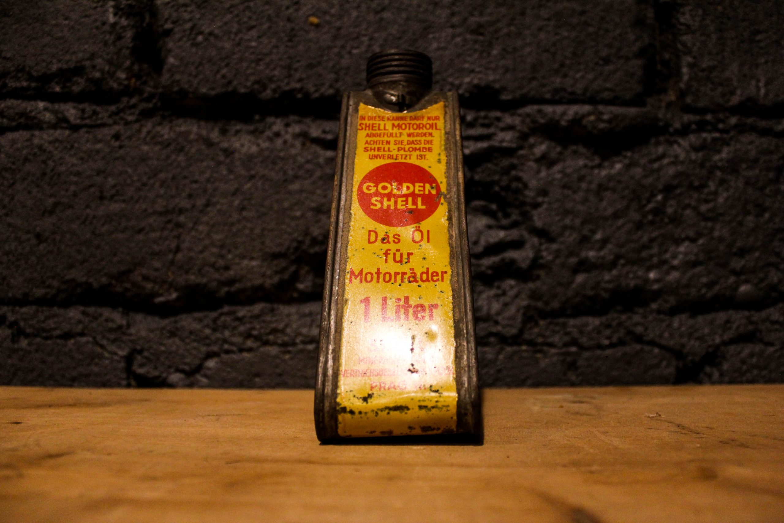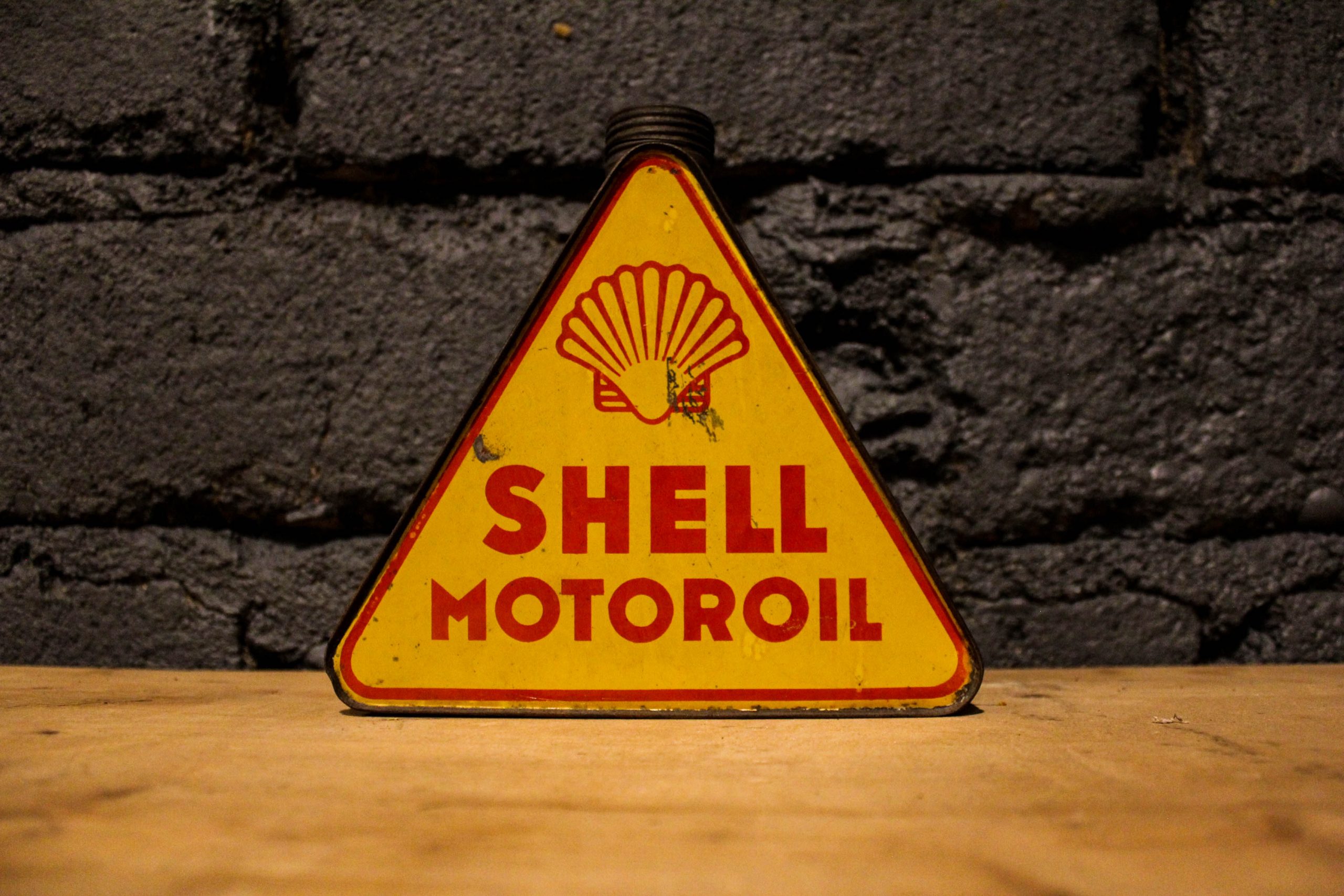 Bidon triangulaire Shell Motor oil avec son bouchon, beau jus et non percé.