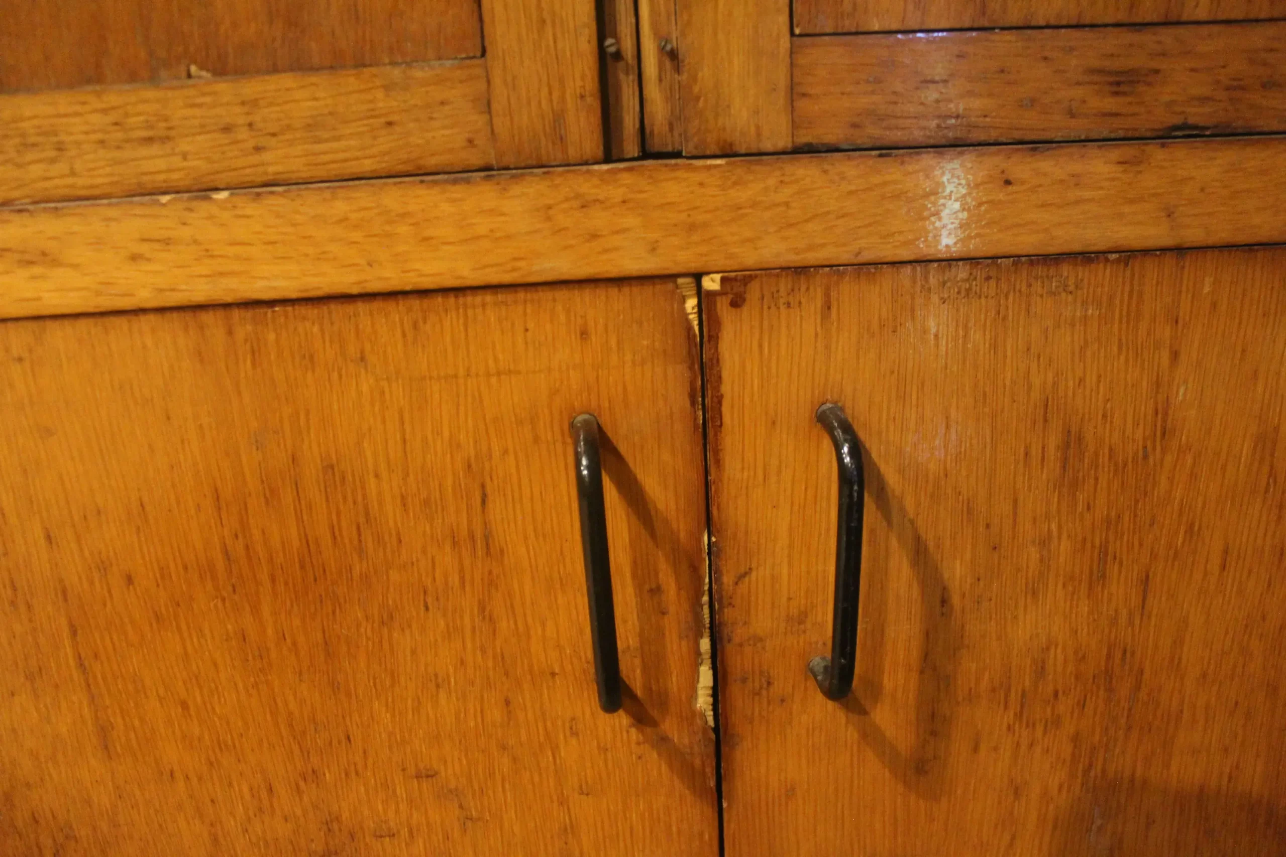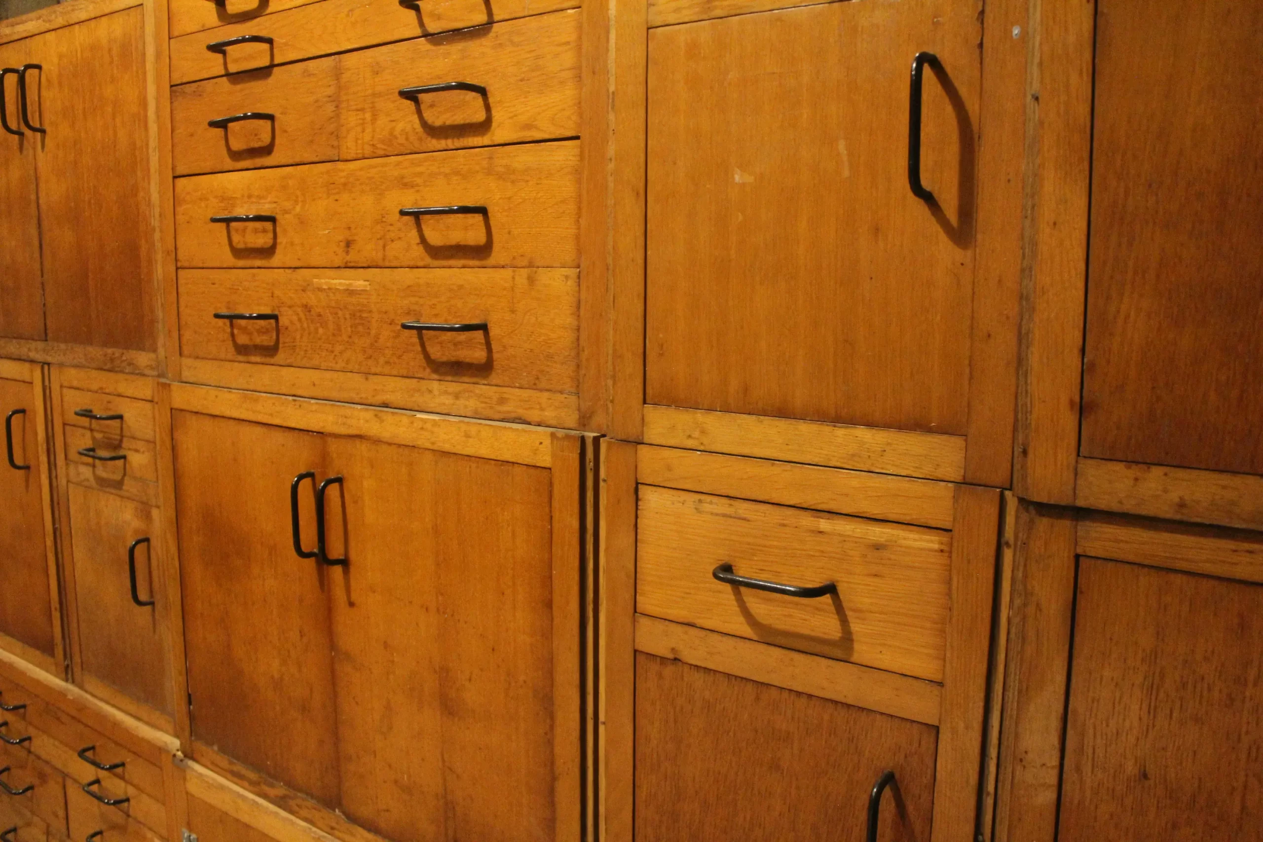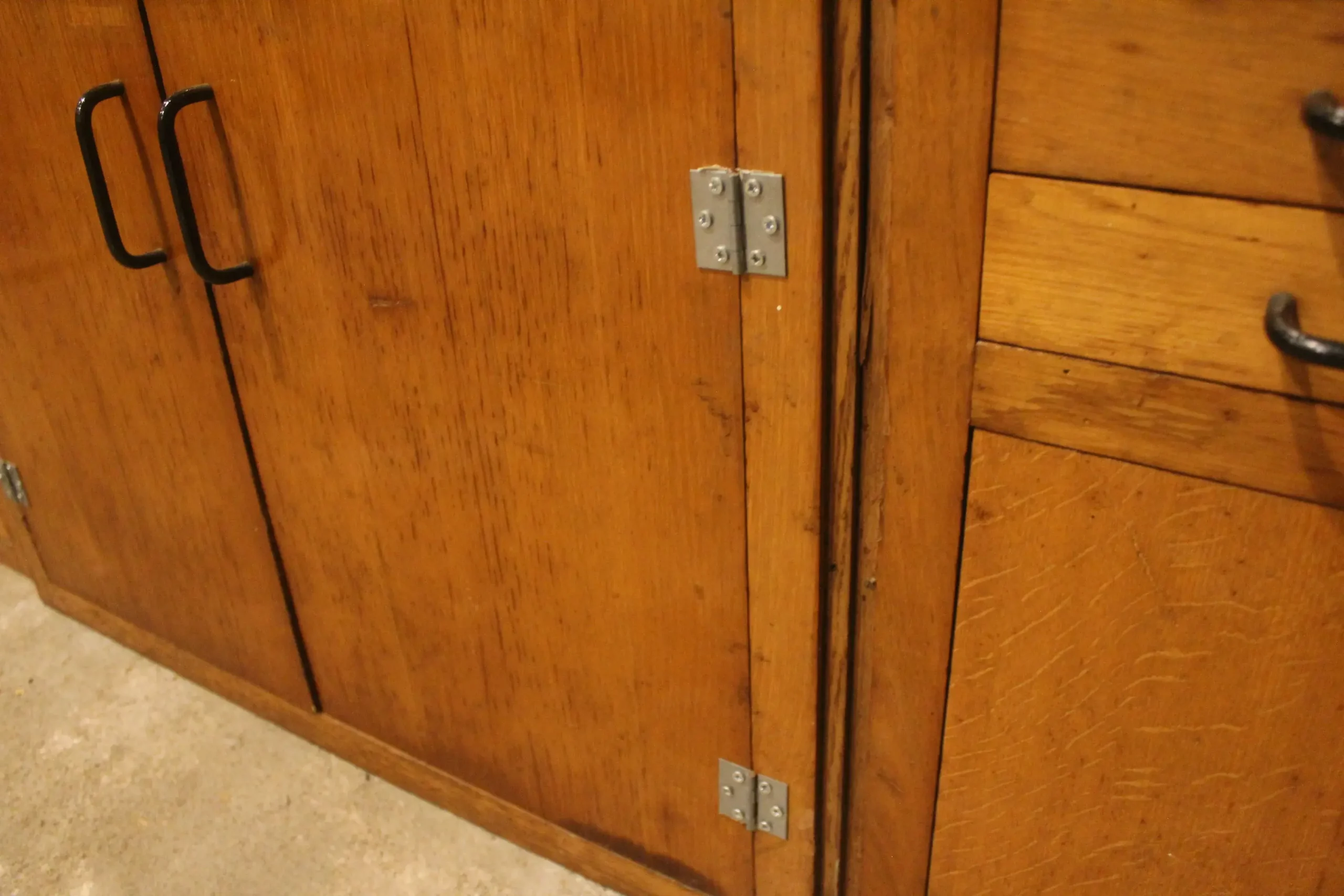 Tiroirs, portes, rangement industriel. Certains défauts sur le placage + les charnières.