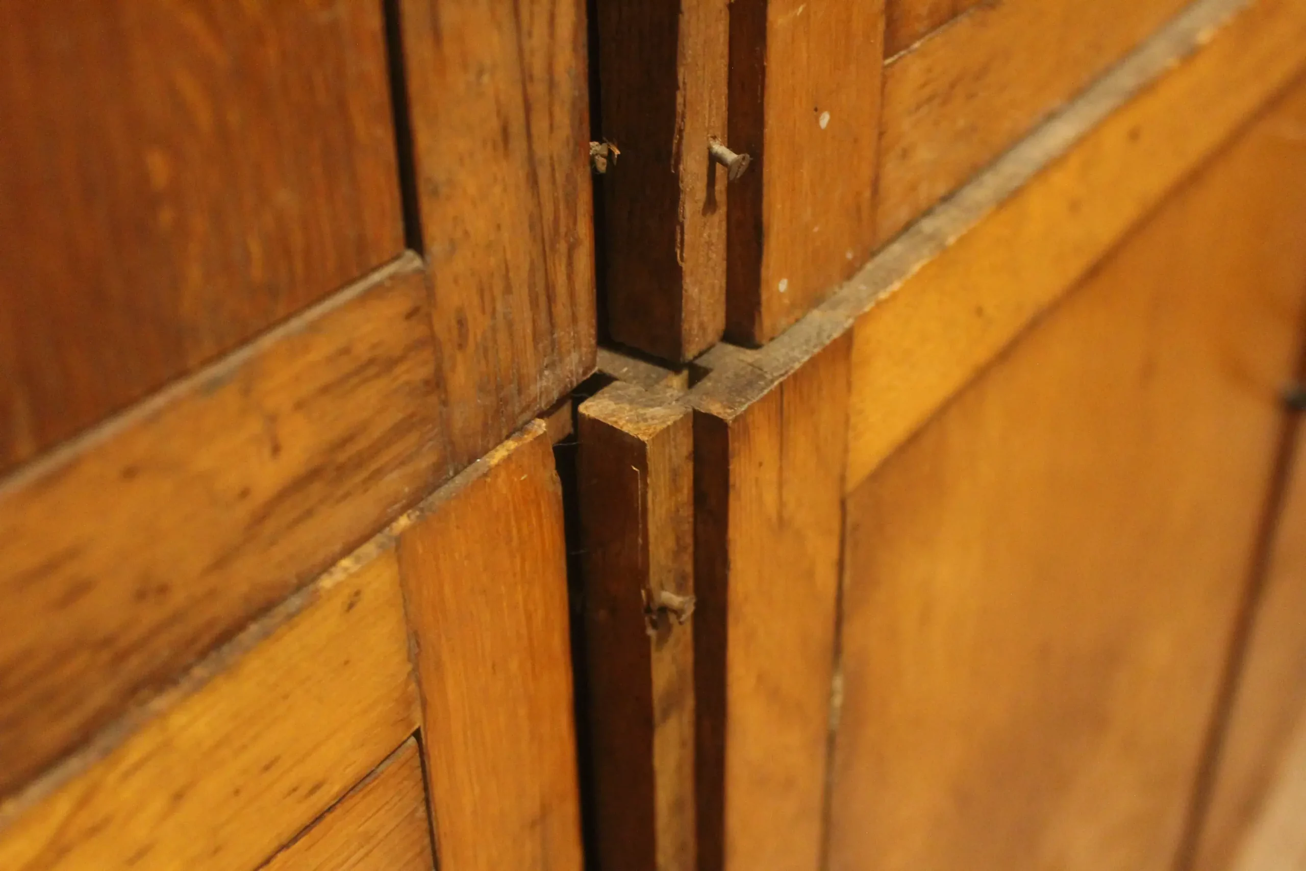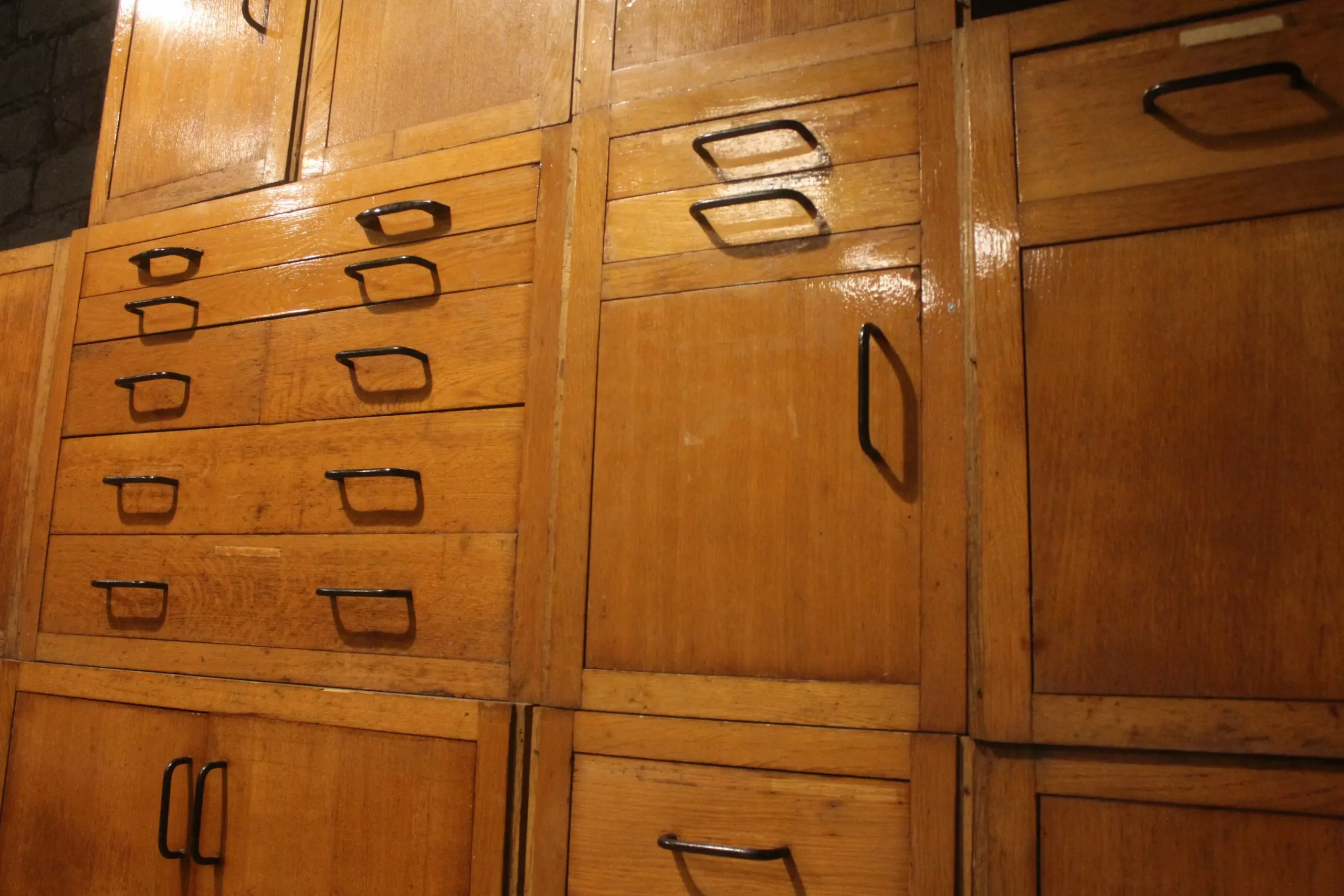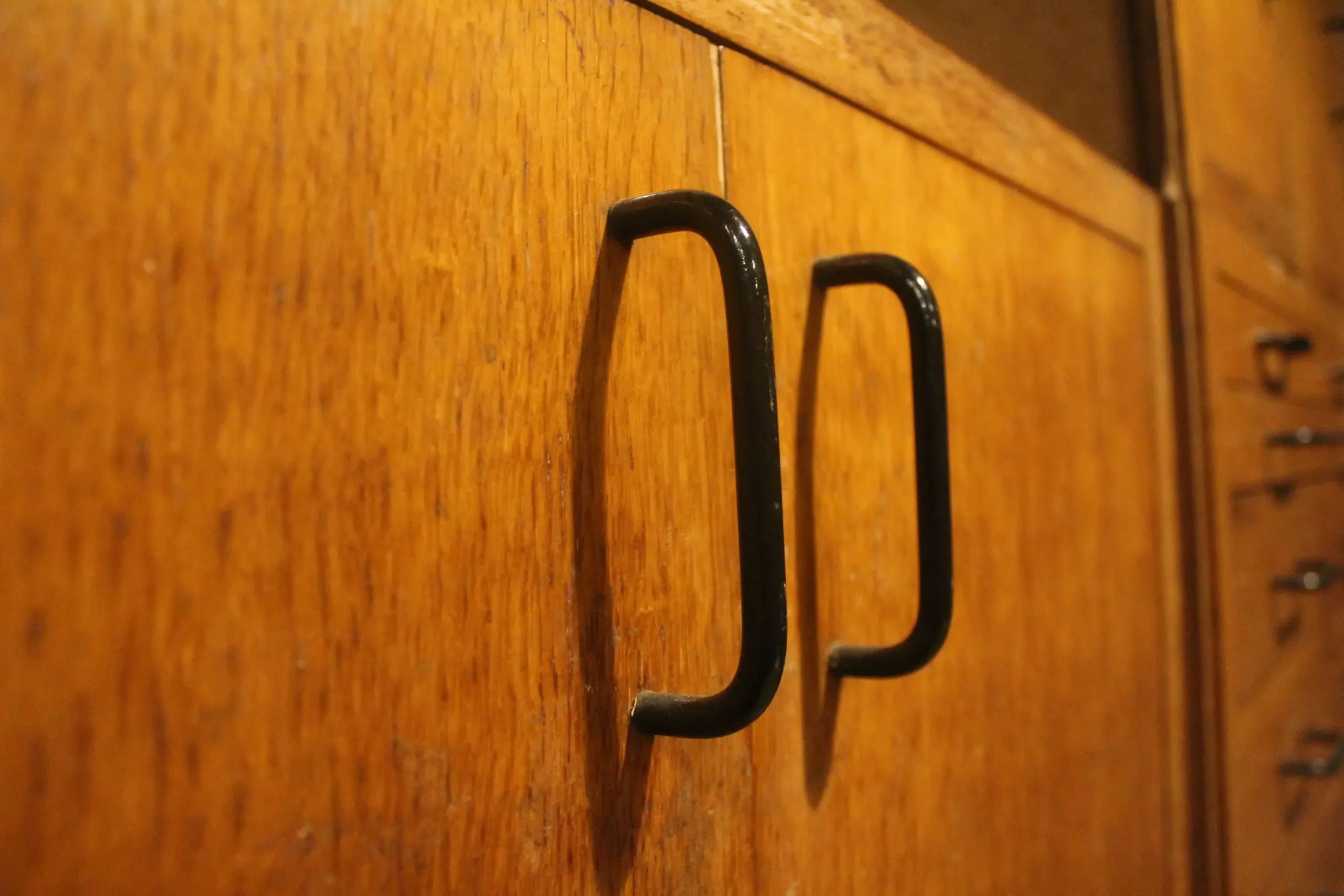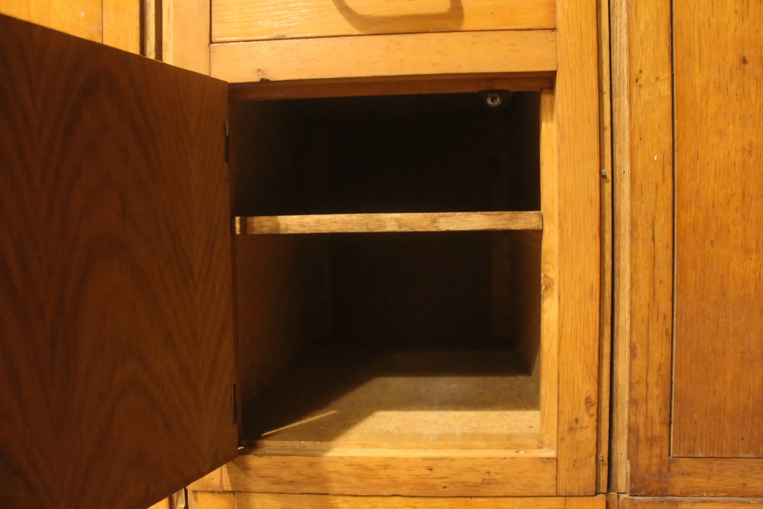 Tiroirs, portes, rangement industriel. Certains défauts sur le placage + les charnières.
