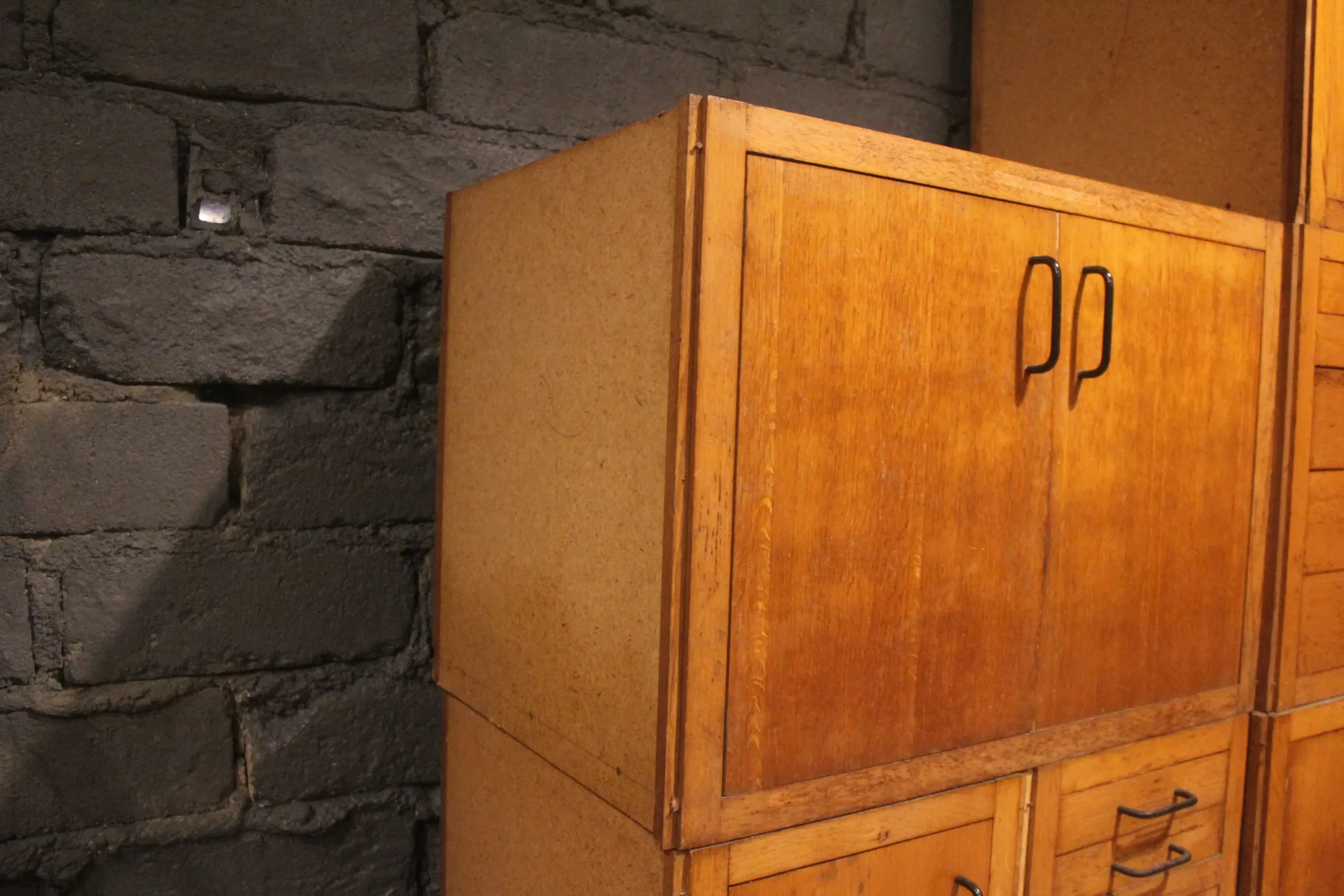 Ces caissons en bois simple et double, modulables, issus d’un ancien laboratoire des années 60-70, sont des pièces authentiques et pratiques.