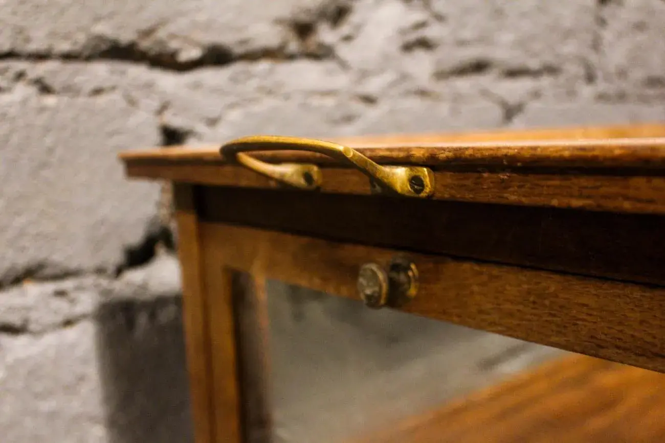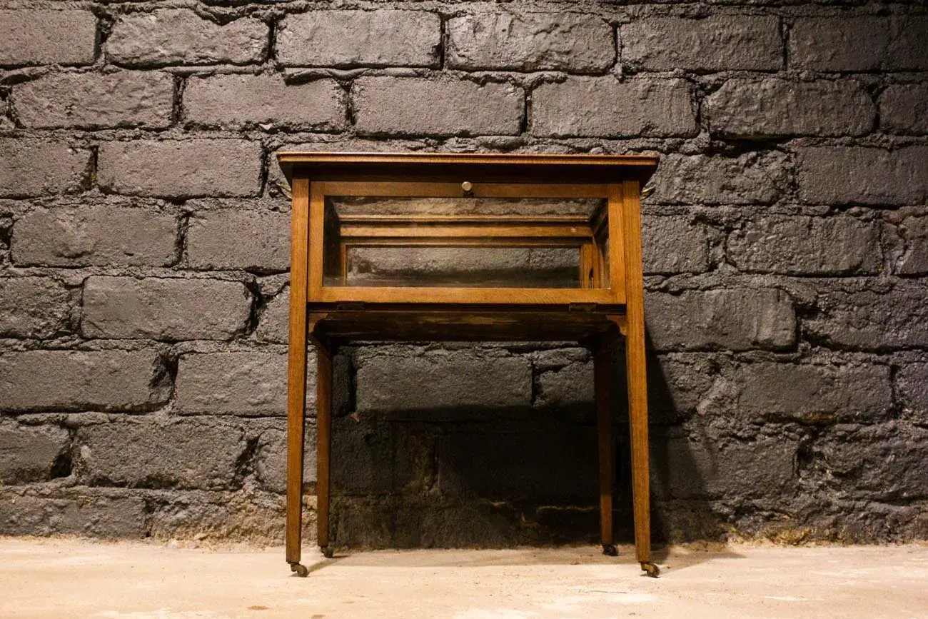 Les détails en laiton, tels que les roulettes et les poignées, témoignent de la qualité et du savoir-faire de l’époque. Les charnières, également en laiton, assurent une ouverture et une fermeture en douceur des côtés.
