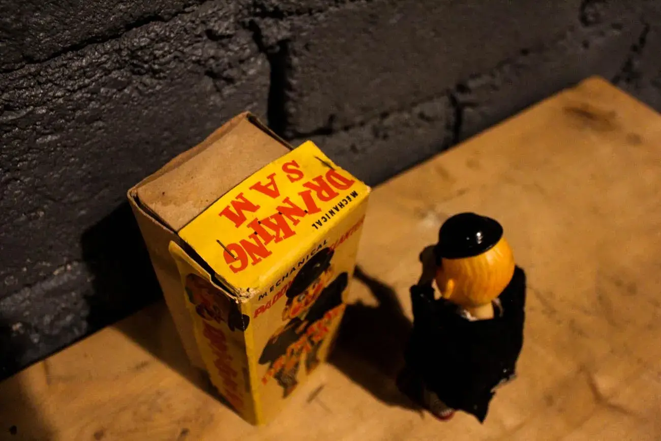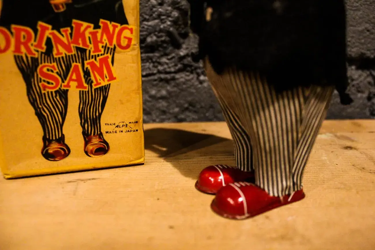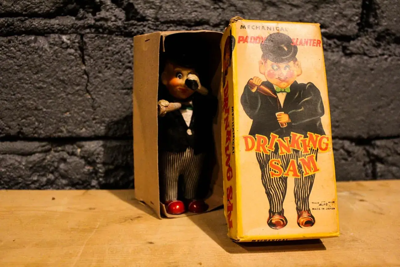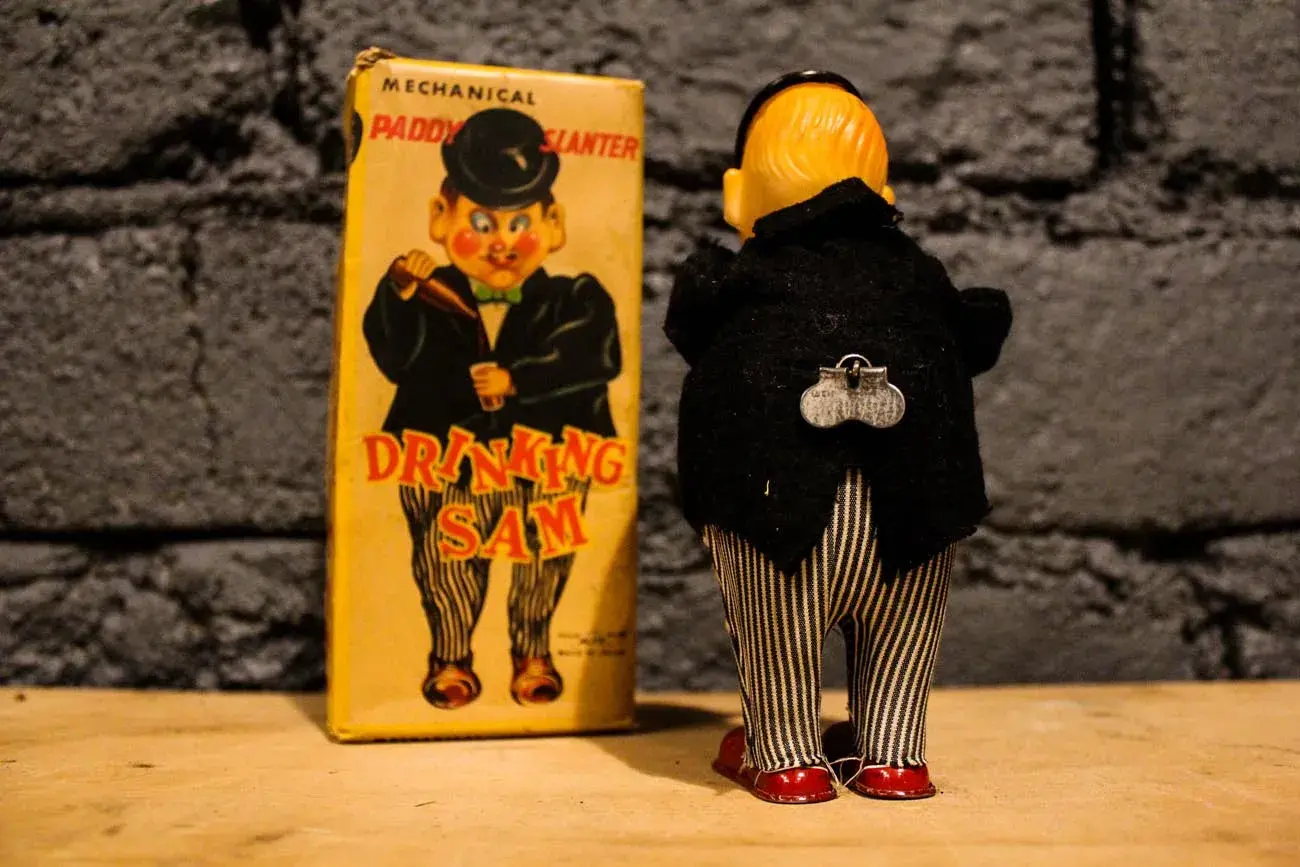 Jouet mécanique Drinking Sam, complet et fonctionnel avec sa boîte.