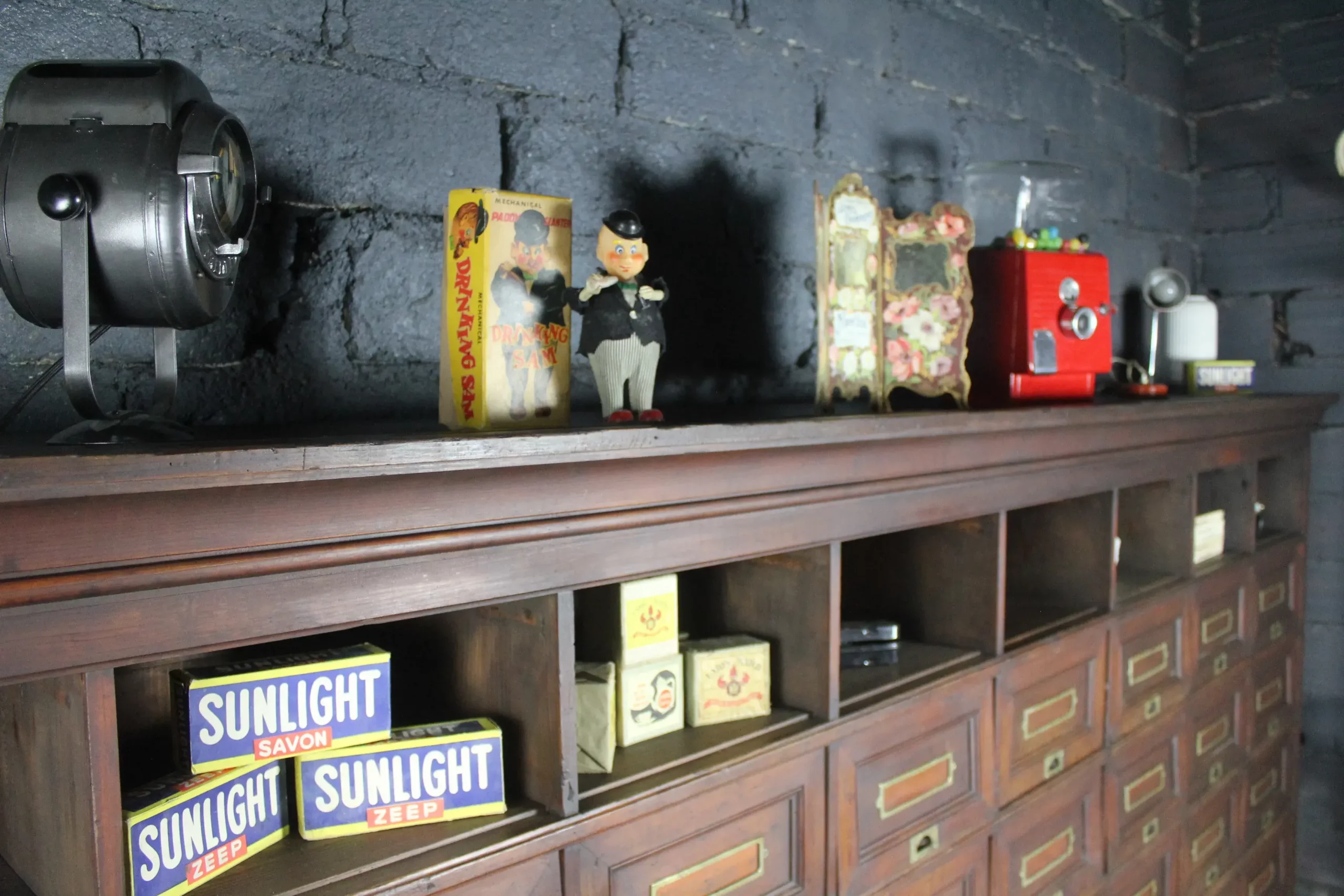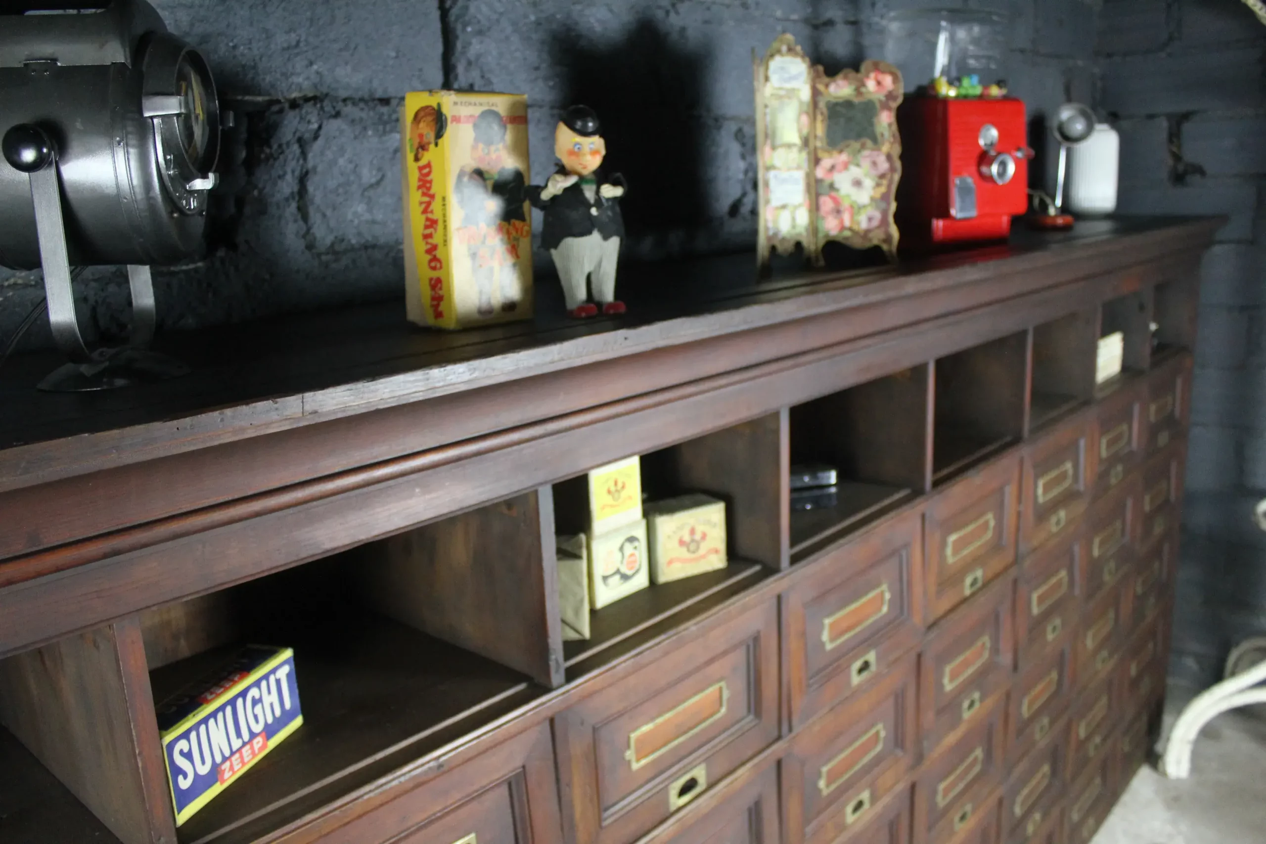 Il dispose de 40 portes s’ouvrant à l’intérieur, chacune équipée de poignées et de porte étiquettes en laiton d’origine.