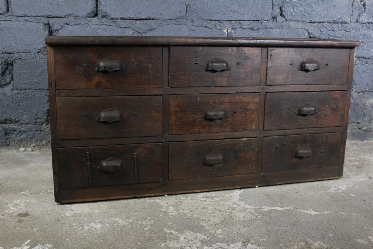 Meuble quincaillerie vintage, 9 tiroirs compartimentés, poignées coquille, visserie d’époque.