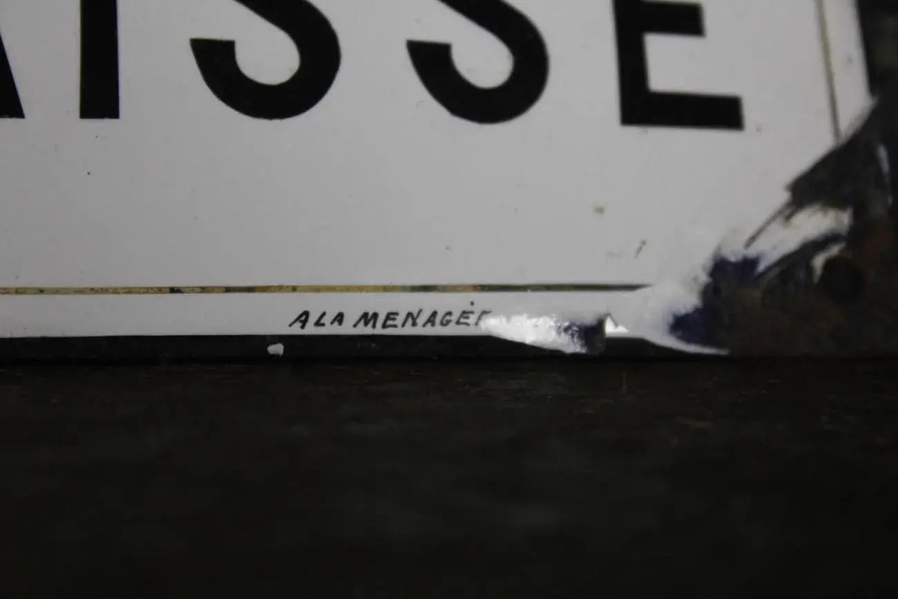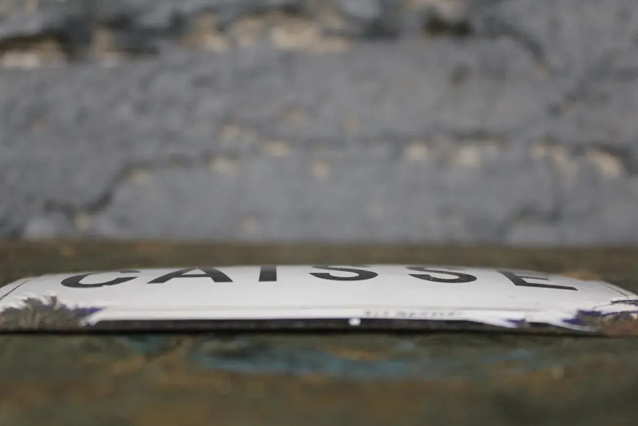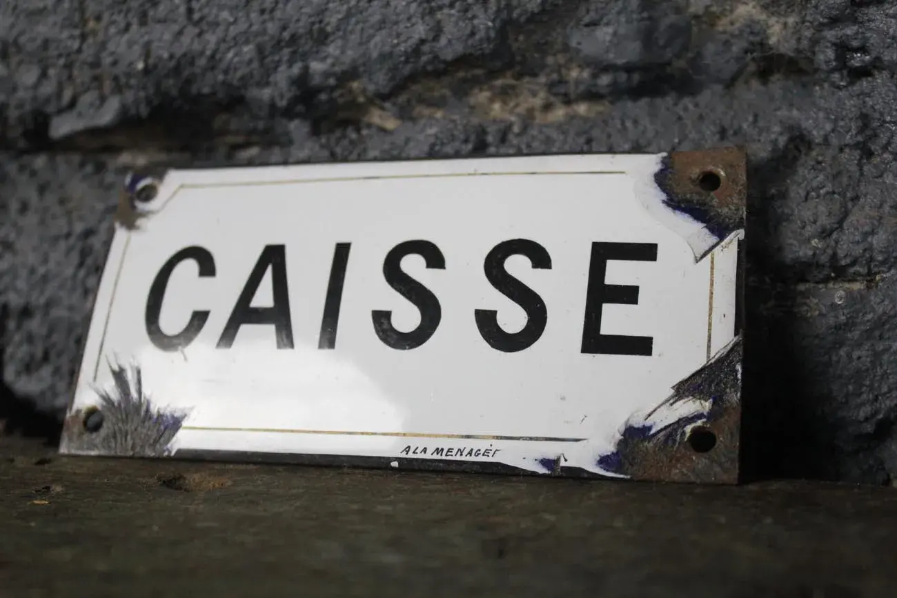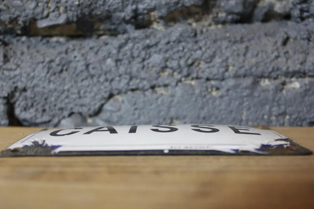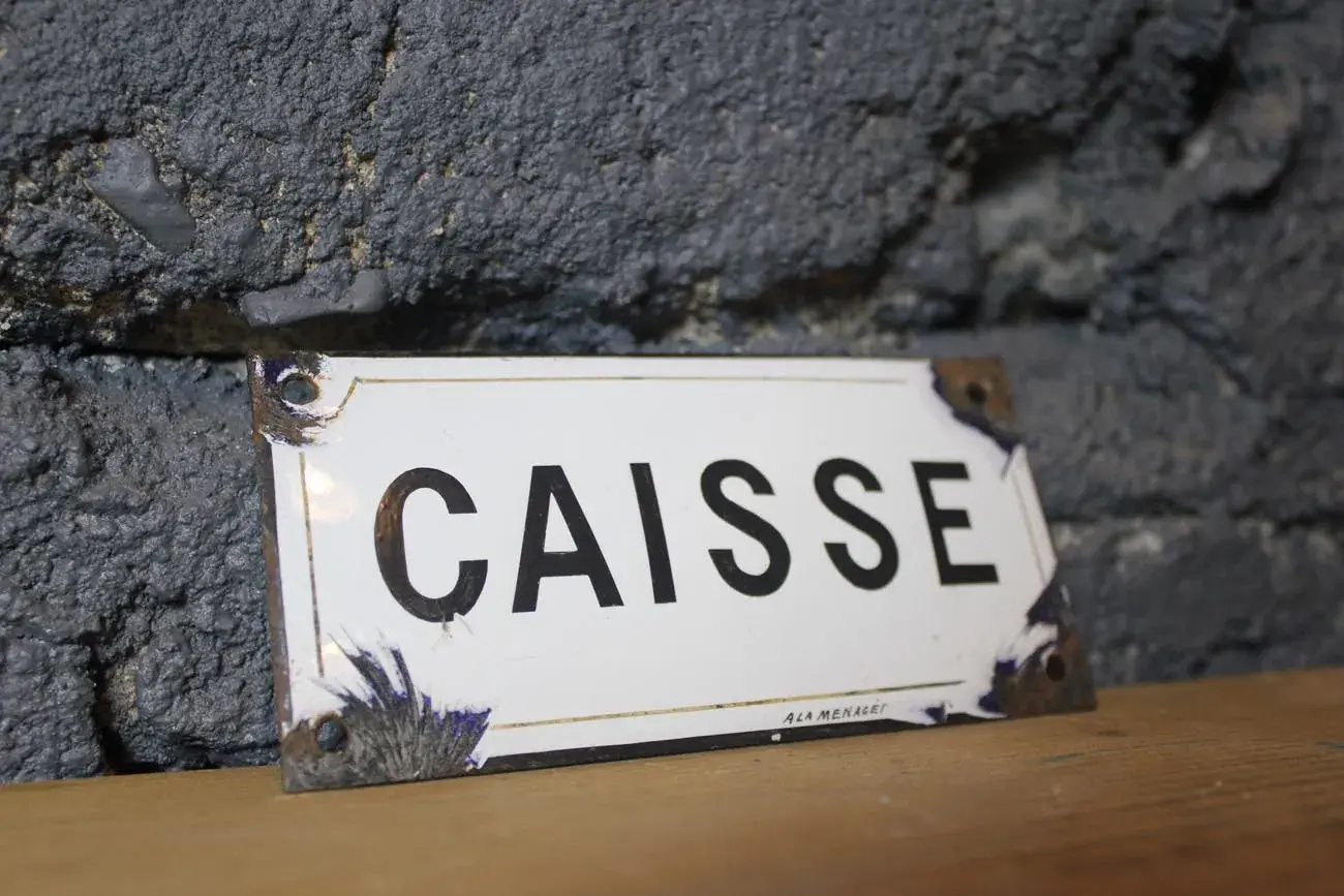 Cette petite plaque émaillée « CAISSE » est une pièce de collection authentique, témoin d’une époque révolue.