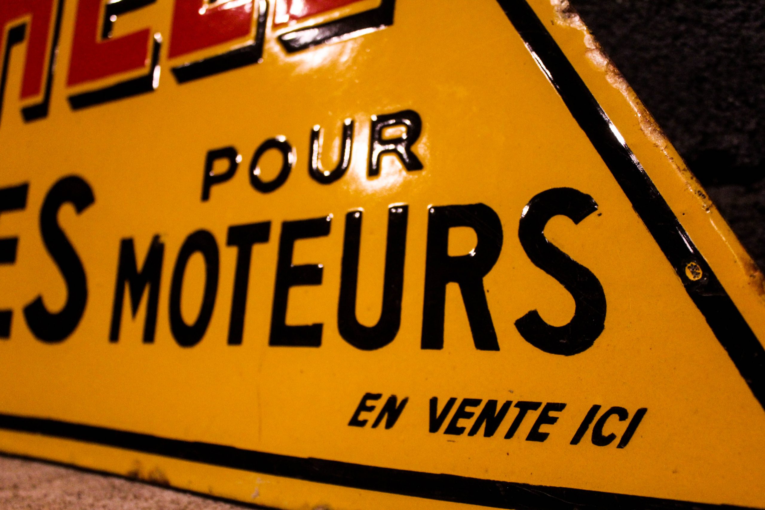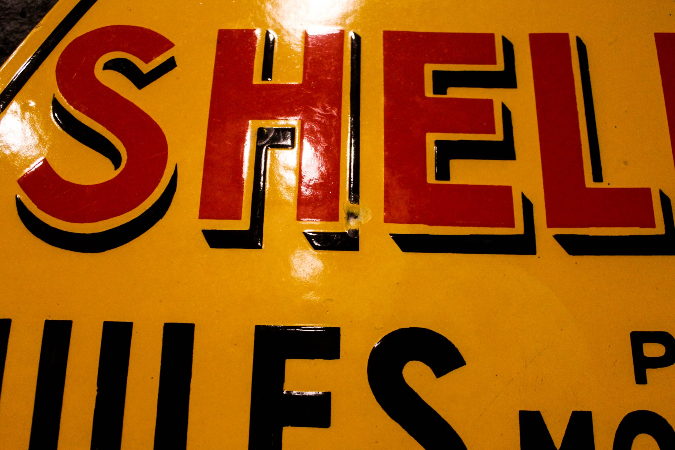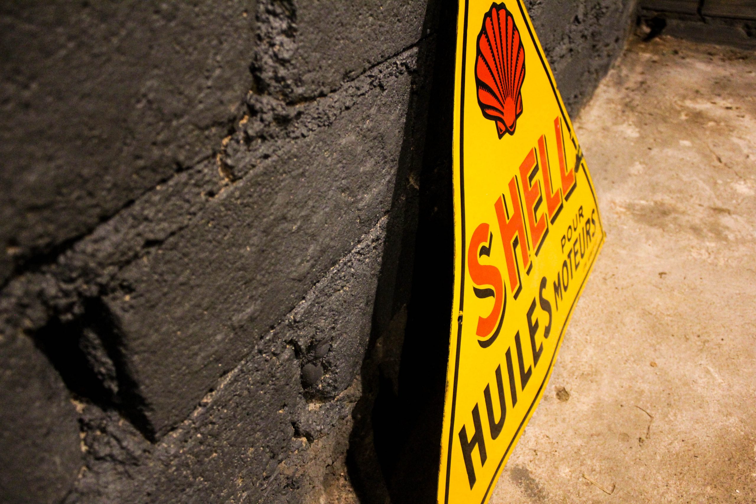 Plaque émaillée triangulaire SHELL, double face, années 30.