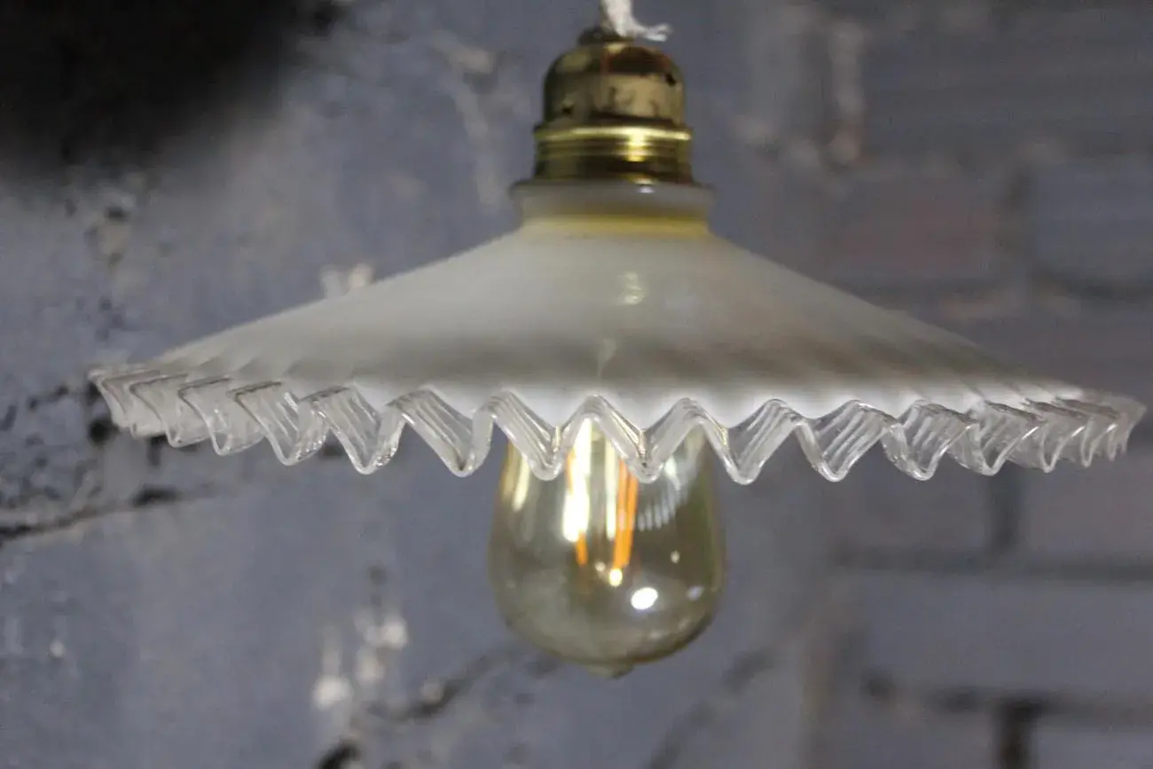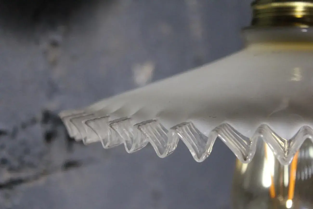 Cette suspension en opaline dentelée, datant des années 30, est une pièce de collection en parfait état.