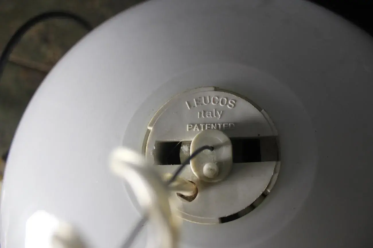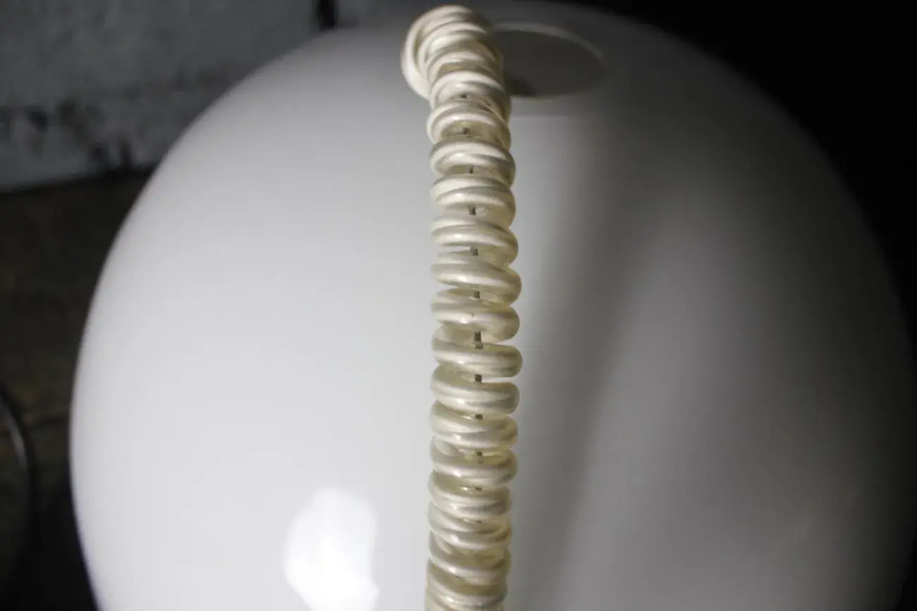 Le support de lampe d’origine Leucos, avec son câble électrique en spirale, témoigne du design iconique de la marque.