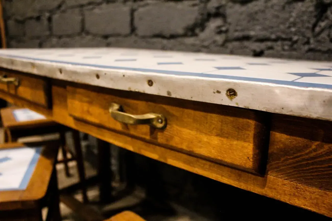 Bel ensemble d’une table avec ses 2 tiroirs, 2 chaises et 2 tabourets émaillés avec crédence à carreaux bleu et blanc.