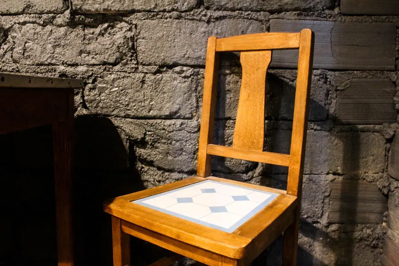 La structure en bois massif apporte une touche d’authenticité et de robustesse à l’ensemble. Les assises émaillées, avec leur motif géométrique, offrent un confort agréable et un entretien facile.